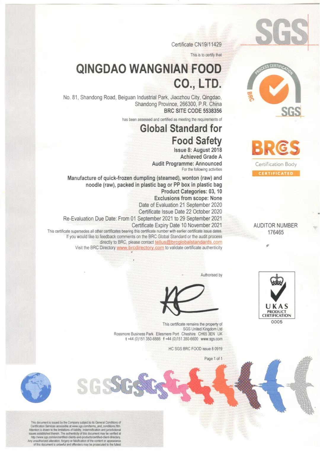 青島旺年食品有限公司BRC認(rèn)證A級證書