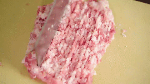 你會(huì)發(fā)現(xiàn),剁好之后的肉餡,跟沒剁的肉餡有一定的區(qū)別:剁好后肉餡會(huì)很有彈性!